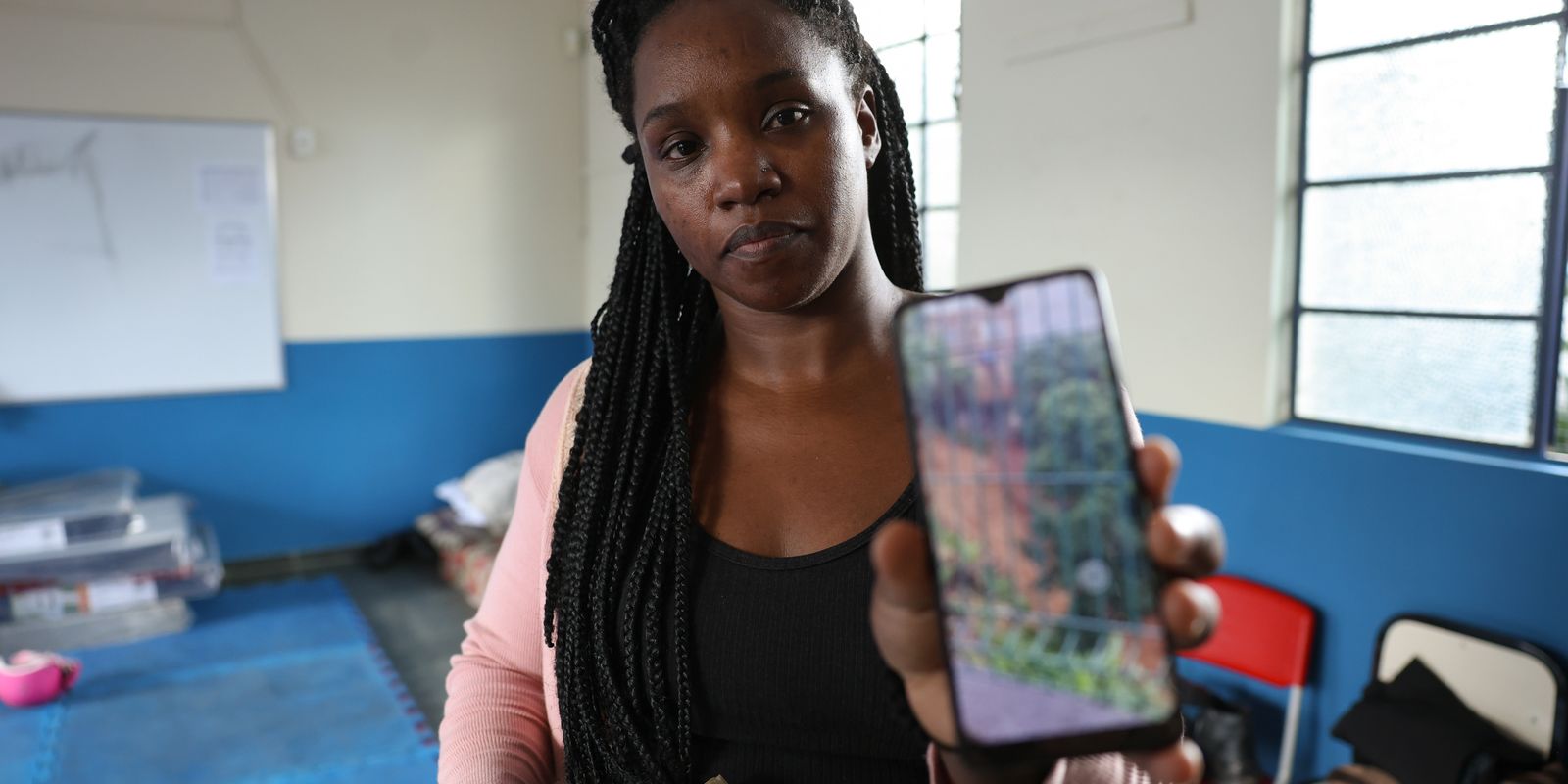 Em uma das salas de aula da Escola Municipal Murilo Mendes, em Juiz de Fora, a auxiliar de cozinha Daniele Saldanha tenta reorganizar a vida. Os pertences estão distribuídos de forma improvisada em cadeiras, e há colchonetes espalhados pelo chão sobre um tapete de borracha infantil.