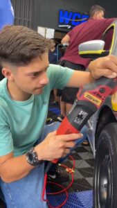 Na parte externa, o processo é igualmente minucioso. “Tem todo um processo: lavagem da caixa de roda, do pneu, da roda, da lataria. Você começa fazendo uma pré-lavagem com Snow Foam para jogar a espuma por cima. Na primeira lavagem, você não esfrega, espera agir de um a dois minutos na lata, e vem fazendo a remoção com a água. Depois, joga mais uma mão com a espuma e faz a esfregação, tira a água, seca o carro. Aí você aplica os produtos finais, que é uma cera, um revitalizador de plástico, um pretinho no pneu, um selante.”